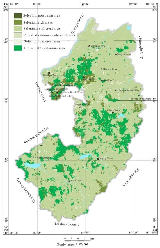 - Liu, Y.; Jiang, B.; Zhang, H.; Sun, Z.; Wang, S. Geochemical characteristics of selenium in surface soil of Qingzhou City, Shandong Province. Geoscience 2022, 36, 933–940. [Google Scholar]