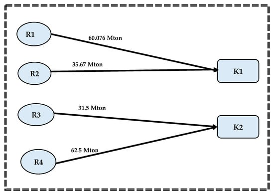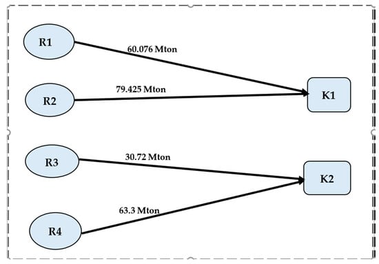 Based on the obtained results, the maximum CO2 exchange from sources to sinks reaches 233.5 million tons. Consequently, there is no unutilized storage since the whole sink capacity is fully utilized, although an additional 16.605 million tons requires alternative storage capacity. The optimum CCS network has been developed using the superstructure method as shown in Figure 2. Sink 1 receives CO2 from sources 1 and 2. Source 1 sends 60.076 Mton of CO2 to sink 1, which also receives 79.425 Mton from source 2. Sink 2 receives CO2 from sources 3 and 4. Source 3 sends 30.72 Mton of CO2 to sink 2, which also receives 63.3 Mton from source 4. The total flowrate of CO2 exchanged is 233.5 Mton. The CO2 from sources 2 and 4 has not fully been stored, requiring alternative storage for 16.605 Mton. The percentage of CO2 captured is 93.36%. There is no unutilized storage in this configuration. These results match well with the results obtained in Dwiputro et al.’s work [29].