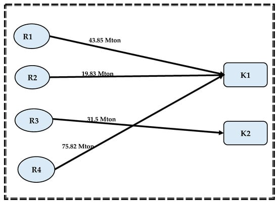 For priority 2 (minimizing the total CCS cost), the obtained results illustrate that the total cost of carbon capture and storage system is USD 610 million/year and the maximum exchange of CO2 load from sources to sinks is 154.395 Mton. Therefore, there is unutilized storage of 62.5 Mton, with an additional 79.105 Mton requiring alternative storage capacity. Comparing these results with the results achieved by applying model 1, it is noticed that the total CCS cost is decreased by 48%, while the captured CO2 is decreased from 93.36% to 68.37%. As shown in Figure 4, sink 1 receives CO2 from sources 1, 2, and 4. Source 1 sends 43.845 Mton of CO2 to sink 1, which also receives 19.83 Mton from source 2 and 75.82 Mton from source 4. Sink 2 receives CO2 from source 3, which sends 31.5 Mton of CO2 to sink 2.