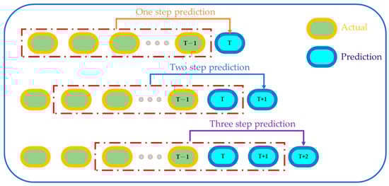 In the field of short-term load forecasting (STLF), multi-step forecasting methods play an essential role [18,19]. This method provides forward-looking decision support for real-time scheduling and energy management of the power grid by forecasting a series of load values at continuous time points. As shown in Figure 1, multi-step forecasting can not only reveal the trends of load changes but also capture their periodic characteristics, which is often difficult to achieve in single-step forecasting. Through this approach, a more comprehensive understanding of the dynamic evolution of electricity demand is gained, providing more accurate guidance for the operation of the power grid.