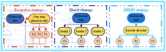 In multi-step forecasting, the input data for each forecasting step can remain consistent or vary according to the strategy, making the architectural design of multi-step forecasting a key consideration. Multi-step forecasting can be implemented through three main inference strategies [20], as shown in Figure 2: recursive strategy, direct strategy, and Multiple-Input Multiple-Output (MIMO) strategy.