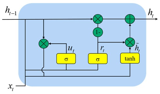 The gated recurrent unit (GRU) is a special type of Recurrent Neural Network (RNN) unit, proposed by Cho et al. in 2014 [21]. The GRU is designed to address the long-term dependency issue encountered by traditional RNNs when processing long sequence data [22]. The GRU introduces an update gate to control the flow of information, thereby enhancing the model’s memory capacity for long-term dependencies [23,24]. The neuronal structure of the GRU is shown in Figure 3.