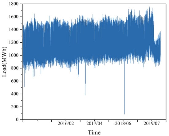 The dataset used in this study draws on the work of Aguilar Madrid and Antonio, who successfully applied machine-learning techniques for electric load forecasting in their previous research [29]. The dataset for this study covers multiple key variables, including hourly historical electric load and periodic forecast data recorded by the National Electricity Network Operator (CND) of Panama, eight types of data related to the school calendar provided by the Ministry of Education of Panama, holiday calendar information published by the “When on Earth?” website, and meteorological data of three major cities collected by the Earth data platform. The detailed description and statistical characteristics of these data are reflected in Table 1. The dataset spans from 00:00 on 3 January 2015 to 12:00 on 27 June 2020, with a total of 48,048 observations recorded, providing rich historical data support for the short-term electric load forecasting model in this paper.