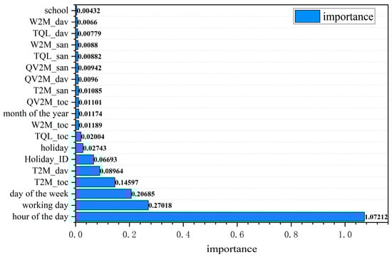 This study employed a hybrid feature extraction method based on decision trees to identify and quantify the contribution of each feature to electric load forecasting. As shown in Figure 8, the ranking of feature importance reveals the influence of different features. In particular, the time-related feature variable “hour of the day” shows the highest predictive importance among all considered features, which is represented by a significant peak in the Figure 8. To streamline the model and reduce the interference of unimportant features, a threshold of 0.01 was set as the criterion for feature selection. All features with importance scores below this threshold were considered to have limited contribution to the prediction and were excluded from the model input, ensuring that the model focused on the most predictive variables.