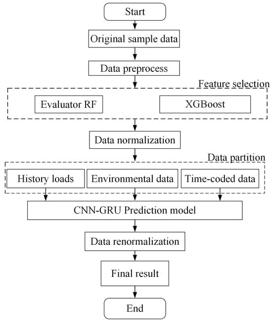 This model has been trained with 13 meteorological and temporal features as well as historical load data, and has been validated at different times of the year to ensure the model’s generalization ability. Before model training, the raw data were thoroughly preprocessed to remove noise and outliers, impute missing values, and ensure data quality. In addition, through the feature selection process, RF and XGBoost were used to select the most critical subset from the input features for the prediction task, preparing for feature extraction and time series prediction in the CNN and GRU parts.