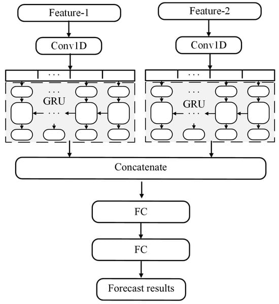 The data include load demand (nat_demand) and features such as weather and time, as shown in Table 2. Figure 10 illustrates a single-channel CNN-GRU model. As shown in Figure 11, our model framework has been carefully designed with two feature input streams, namely Feature-1 and Feature-2. Feature-1 consists of many electric load observations before the prediction moment, as well as corresponding time and weather features, aiming to capture the local patterns of load changes in the short term. Feature-2 is composed of load data and their time and weather features at the same time points from the previous weeks, used to reveal the trends and periodicity of load changes in the long term. For example, using historical data from the same time points over the previous four weeks, along with the weather and time features of the prediction point, a Feature-1 input feature is constructed. A Feature-2 input feature is composed of the last ten historical data points and the weather and time features of the prediction point. These two input matrices correspond to one output value, which is the prediction point. These two sets of features are inputted into the CNN-GRU model through parallel paths. The convolutional neural network (CNN) part is responsible for extracting key features from Feature-1 and Feature-2, and reducing the spatial dimensions of the data through pooling layers, thereby simplifying the complexity of the model. Subsequently, the gated recurrent unit (GRU), as a time series model, deeply learns these features and trains the model to achieve accurate predictions of future electric load.