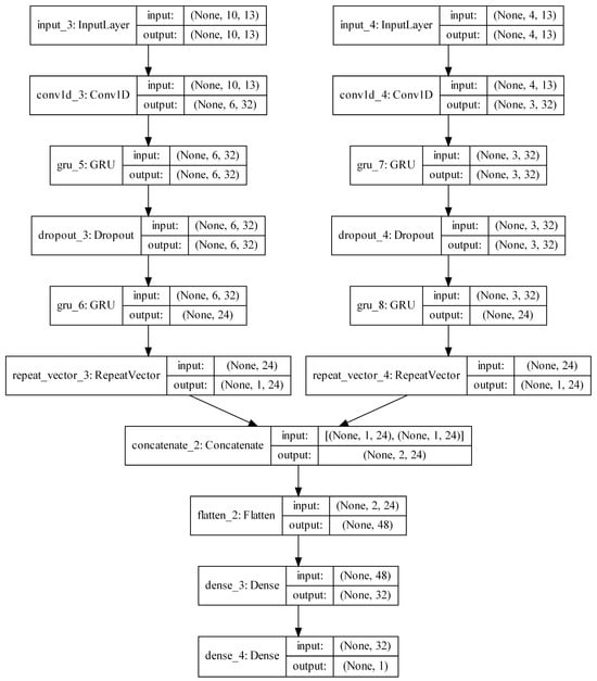 In the design of the convolutional layer, one-dimensional convolution operations were employed, equipped with 32 convolutional kernels, each sized at half the number of input features, and the sigmoid function was chosen as the activation function to introduce nonlinearity. In the design of the GRU network, two hidden layers are set up, the first layer containing 32 neurons and the second layer containing 24 neurons, both using the sigmoid function as the activation function. To enhance the model’s generalization ability and prevent overfitting, dropout regularization is introduced in the network, with a ratio set to 0.1.