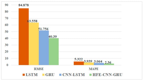It can be seen from Figure 13 and Figure 14 that in terms of MAPE, our method has improved by 29.83% compared to the CNN-LSTM model. Compared with other models, the performance improvement of the model proposed in this paper in terms of RMSE and MAPE is between 28.140% and 110.146%, and 29.830% and 125.508%, respectively, demonstrating the strong predictive performance of the model. The LSTM model and GRU model with added CNN for feature extraction showed improvements of 63.996% and 73.694%, and 57.3% and 66.907% in RMSE and MAPE predictive performance, respectively, fully demonstrating the feature extraction capability of the CNN. Figure 14 shows the load curve changes of the proposed model and comparison models over time. Our model can closely follow the changes in load peaks and troughs, and it performs excellently whether on holidays or working days.