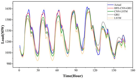 To highlight the superiority of our model, comparisons were made with all candidate machine learning models, including CNN-LSTM, LSTM, and GRU, among others. The changes in model evaluation metrics are shown in Figure 13, and the load curve forecasts are shown in Figure 14. Table 5 presents a comparison of the running times of each model. It can be seen from Table 5 that, although our model architecture is complex, it generally meets the requirements in terms of running time.