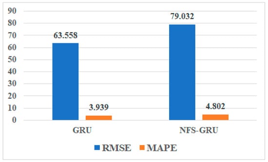 One of the features of our model is the use of integrated XGBoost-RF for feature selection, followed by a dual-channel recursive prediction structure. Comparative experiments have also been conducted in feature selection, with model evaluations as shown in Figure 15 and load curves as shown in Figure 16. One group employed the GRU model with information directly sourced from the original dataset, while the other group used the NFS-GRU model (NFS stands for “No Feature Selection”), where time-related variables were artificially added and the integrated XGBoost-RF feature selection method was utilized to select the input features. Figure 15 reveals that the GRU model using the feature selection method improved by 21.909% in MAPE and 24.346% in RMSE compared to the NFS-GRU model. Figure 16 also demonstrates the excellence of this method. Although it cannot completely follow the changes in load, the overall trend is stronger than that of the GRU model without feature selection, which also illustrates the importance of feature selection in model construction. A good feature selection method is more beneficial to the predictive performance of the model.
