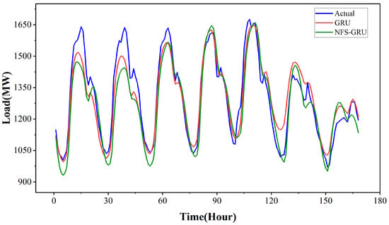 Load forecast curve plot of the GRU model vs. NFS-GRU model.