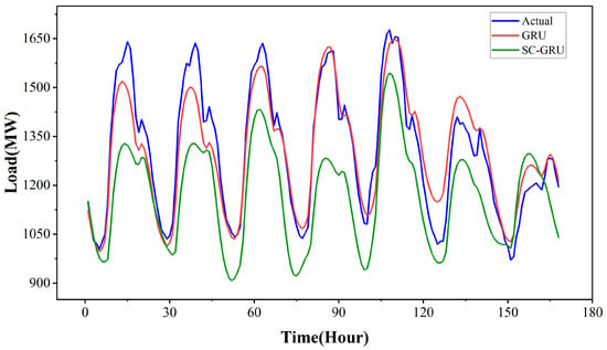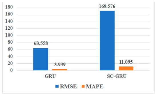 To further demonstrate the superiority of the dual-channel structure, a comparative experiment was established with the GRU as the base model, as illustrated in Figure 17. One group uses our dual-channel input structure for recursive iterative prediction, and the other group uses the single-channel GRU (SC-GRU), which only uses neighboring historical load points as input. Figure 17 reveals that the GRU model using the dual-channel structure has improved by 166.805% in MAPE and 181.670% in RMSE compared to the NFS-GRU model. The dual-channel architecture is more conducive to the model’s search for historical regularity in changes in load. Figure 18 clearly shows that the GRU model is accurate for the first few data points in prediction, fitting the changes of the true values very well. However, as the prediction time progresses, the errors accumulate, the model loses its predictive ability, and the curve shows periodic changes, deviating from the actual value changes. Although the impact of time and weather on the input has been considered, accurate prediction of the actual load remains challenging. However, the trend of actual load fluctuations follows the changes in the actual load, suggesting that this trend can still be discerned by the model, although not perfectly.