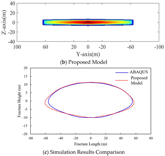To verify the effectiveness of the proposed model, the fracture geometry simulated with the proposed model was compared with the simulation result by ABAQUS. In the verification, the maximum horizontal stress and minimum horizontal stress were 57.6 MPa and 48.2 MPa, while the Young’s modulus and Poisson’s ratio were 34.6 GPa and 0.31, respectively. Figure 1 shows the simulation results from the proposed model and ABAQUS. From the simulation, it can be found that the fracture length and fracture height from the proposed model and ABAQUS had the same tendency. Compared with the results from ABAQUS, the error of fracture length and fracture height were 1.41% and 1.28%, respectively. The effectiveness of the proposed model was verified.