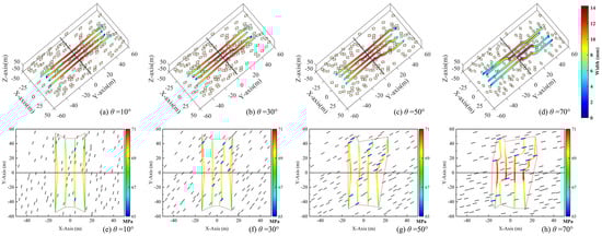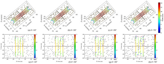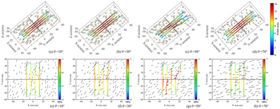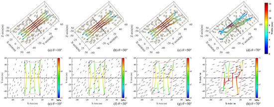 Figure 2a–d demonstrate the hydraulic fracture morphology under the influence of different natural fracture angles when the horizontal stress difference is 2 MPa. The hydraulic fracture complexity increased significantly with the increasing angle of the natural fracture. From Figure 2d, it can be seen that the hydraulic fractures even merge when traversing the high angle (70°) natural fracture region, which showed a two-wing fracture after the interaction at low horizontal stress difference. In addition, two hydraulic fractures appeared to merge with the assistance of natural fractures. The fracture pressure distribution in Figure 2e–h shows that the hydraulic fracture was captured by the natural fracture and then suffocated to drive up the fracture pressure. This phenomenon was more obvious in the area of high-angle natural fractures, because high-angle natural fractures are more difficult for hydraulic fractures to deflect, and the fracturing fluid accumulates in the natural fractures to contribute to the rise in pressure.