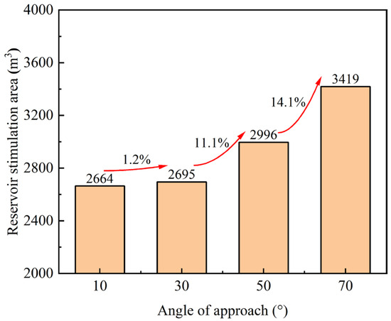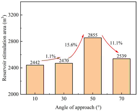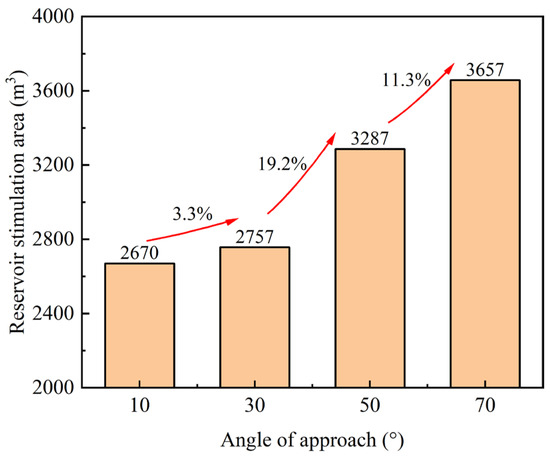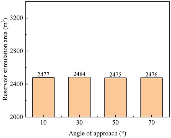 In Figure 9, the impact of various natural fracture angles on the reservoir modification area is displayed for a horizontal stress difference of 20 MPa. The results indicated that the change in area was minimal, with a variation of less than 1%, which suggested that the influence of natural fractures on hydraulic fractures could be insignificant under high stress difference conditions, resulting in a simpler hydraulic fracture pattern.