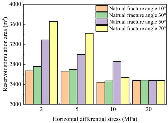 The effects of coupling the horizontal stress difference and natural fracture angle on SRA are presented in Figure 10. The figure shows that as the horizontal stress difference of the target reservoir increased, the area of the reservoir modification zone experienced a decrease. Additionally, the decrease in the area of the high-angle natural fracture zone was more significant when the natural fracture angle of the fracture zone was fixed.