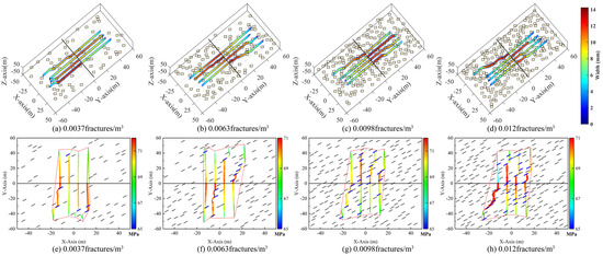 We further investigated the impact of natural fracture density on both the reservoir modification area and hydraulic fracture morphology. The natural fracture density varied between 0.0037–0.012 fractures/m2, the natural fracture length was kept constant at 4 m, the angle of natural fracture was set at 40°, and the horizontal stress difference was 10 MPa. The simulation results under different natural fracture densities are depicted in Figure 11a–d. It can be seen that a higher natural fracture density increased the possibility of hydraulic fractures intersecting with natural fractures. As the number of natural fractures increased, hydraulic fractures experienced significant turning, as seen in Figure 11d of the trajectory illustrations. Based on the observations in Figure 11e–h, it is evident that hydraulic fractures were predominantly captured by natural fractures in certain areas. This was because pressure builds up in hydraulic fractures, leading to a rise in pressure. The hydraulic fracture segment with fewer natural fractures appears lighter in color and had lower fracture pressure. This was also reflected in the fracture morphology as lower fracture width.