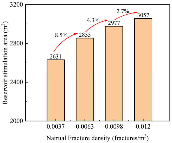 The results presented in Figure 12 demonstrate that the density of natural fractures had a significant impact on the effectiveness of reservoir modification after fracturing. As the natural fracture density increased from 0.0037 to 0.012 fractures/m2, there was a sharp increase in the SRA of the reservoir, resulting in an overall improvement of 15.5%. This suggests that in reservoirs with well-developed natural fractures, hydraulic fractures may become more complex, and the modification area more extensive. However, it is important to note that the increase in reservoir modification area appeared to be less pronounced in formations with highly developed natural fractures. The impact of natural fracture density on reservoir modification area was limited.