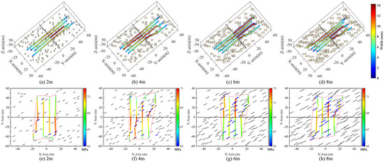 To investigate the impact of natural fracture length on hydraulic fracture morphology, a simulation was conducted with a fixed natural fracture density of 0.0063 fractures/m2, natural fracture angle of 40°, a horizontal stress difference of 10 MPa, and the natural fracture length changed from 2 m to 8 m. The results, shown in Figure 13a, indicate a significant reduction in the probability of hydraulic fractures meeting natural fractures of 2 m. On the other hand, natural fractures of 8 m in Figure 13d were more likely to intersect with hydraulic fractures. Therefore, it can be concluded that an increase in natural fracture length improved the possibility of hydraulic fractures meeting with natural fractures to some extent. The blue natural fractures in Figure 13h were the natural fractures activated by hydraulic fractures; there are obviously more than in Figure 13.
