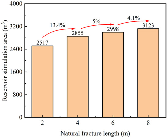Figure 14 shows that fracturing in areas with long natural fractures was equally likely to achieve the same effect as fracturing in high-density areas. The effect of natural fracture length on the area of reservoir modification zone was positive. With natural fractures of 2 m to 8 m in the simulation, the SRA was enhanced by nearly 22.5%, and the fracturing effect was significantly enhanced. As with the effect of natural fracture density, the increase of the SRA under the effect of natural fracture length also decreased. In summary, in an area of high natural fracture density, greater length tended to expand the area of reservoir modification. This can be used as a reference basis when drilling horizontal wells.
