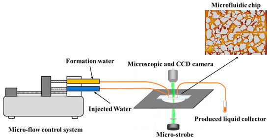 Under the three experimental conditions in Table 2, the saturated dyed produced water from well P was injected into the microfluidic chip for the displacement experiment at a total flow rate of 100 μL/min until reaching pressure stability (the steady state was achieved when the two water types were injected after mixing according to the flow rate ratio, and the unsteady state occurred after displacement with only the injected water after saturation). The experimental image and pressure curve were recorded [19]. The experimental process is shown in Figure 3.