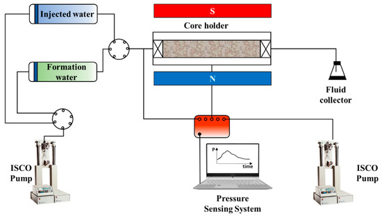 The core displacement experiments were conducted to analyze the degree of reservoir damage caused by the incompatibility between the injected water and the formation water in the formation stage. The degree and scope of reservoir damage were comprehensively evaluated based on segmented core permeability measurements and NMR scans. The MesoMR23-060H-I nuclear magnetic resonance instrument from Newmai, Suzhou, China was used to measure the T2 spectrum. The dried core was first vacuumed in a tank with saturated formation water for 48 h, and NMR scanning was performed to produce the initial T2 spectrum. The core was then placed into the core holder for displacement using the injected water under the reservoir temperature of 69 °C, the confining pressure of 20 MPa, and the injection speed of 0.3 mL/min. The pressure change pattern was recorded in real time. The displacement experiment concluded when the pressure stabilized, and the core was removed for NMR scanning to obtain the T2 spectrum of the core after displacement. The experimental process is shown in Figure 4.