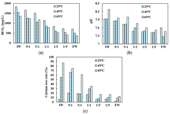 Changes in (a) HCO3−, (b) pH, and (c) calcium loss rate under different injected water (IW)–formation water (FW) mixing ratios.