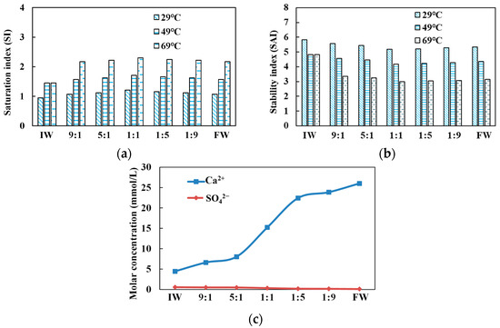 Changes in (a) saturation index, (b) stability index, and (c) Ca2+ and SO42− molar concentrations under different injected water–formation water mixing ratios.