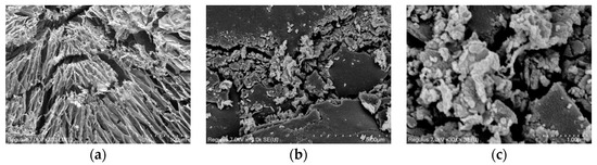 Microscopic morphology of scaling products at different magnifications. (a) magnification 300×, (b) magnification 10,000×, and (c) magnification 30,000×.