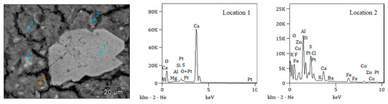 Under scanning electron microscope observations, the scaling products exhibited a unique network structure of blocks and a radial distribution, and their grains were mostly blocks about 11 to 17 μm in diameter. As the magnification increased, obvious lines were observed on the large flakes, and a large number of spheres were observed between the flakes, constituting the complex microstructure of the scaling products. This scaling product structure may be ascribed to their chemical composition, formation conditions, or external environmental factors. The scaling affected the fluid flow and easily led to clogging in the rock (Figure 7 and Figure 8).
