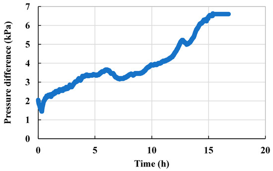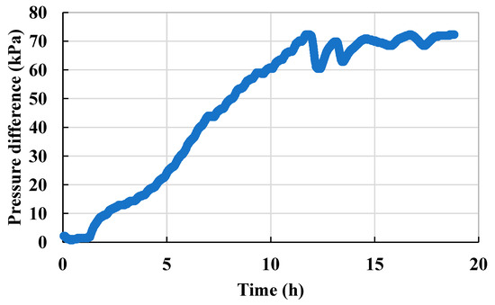 The scaling after water flooding in Scheme 3 was between those in Scheme 1 and Scheme 2, with the pressure difference having increased from 2.2 kPa to 8.64 kPa, and the permeability of the microscopic model decreased to 24% of the permeability before scaling (Figure 13 and Figure 14).