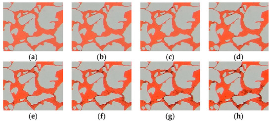The local scaling process is at the main flow channel. (a) 1 h, (b) 2 h, (c) 3 h, (d) 4 h, (e) 5 h, (f) 6 h, (g) 7 h, and (h) 8 h.