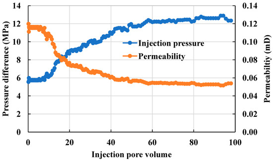 The recorded changes in injection pressure and permeability in Figure 16 show the injection pressure increment is relatively smooth at the initial injection stage but gradually accelerates and finally stabilizes with the increase of the injection multiplier. As a result, the following three stages were found in the scaling process: the scaling induction stage, scaling damage stage, and scaling stabilization stage. With an 8.5 PV injection, the permeability decreased significantly while the injection pressure increased, indicating the end of the scaling induction stage and the initiation of the scaling damage stage. As the injection increased to 47 PV, the permeability and injection pressure stabilized, indicating the initiation of the scaling stabilization stage. Considering the microfluidic experiments, the scaling process in the reservoir mainly comprised supersaturation, crystal nucleation, crystal aggregation, crystal growth, and final crystal deposition. The scaling crystals deposited in the macropores migrated with the water and eventually clogged the smaller pore throats; pore throats with smaller radii were more likely to be clogged by the microcrystals. The final permeability damage rate reached 55%.