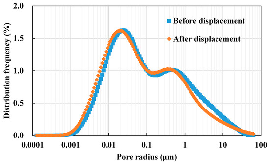 NMR scanning was performed before and after the experiment to obtain the NMR T2 spectra. According to the relationship between the NMR transverse relaxation time and the pore radius, the NMR T2 spectra can be converted into the pore radius distribution curve, as shown in Figure 17. It can be seen that the injected water and the formation water mixing leads to scaling in the core, which alters the pore structure, manifested as an overall leftward shift of the pore radius distribution curve. Calculations yielded that the median pore radius was reduced from 0.0731 μm before displacement to 0.0573 μm, with a reduction of 21.61%.