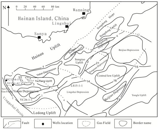 The Qiongdongnan Basin, which is approximately 65,000 km2, is located in the northwest of the continental margin of the northern South China Sea. It is an NEE-striking basin that formed during the Cenozoic era. The Hainan Uplift is to its north, the Yongle Uplift is to its south, and the Yinggehai Basin is to its west (Figure 1) [].