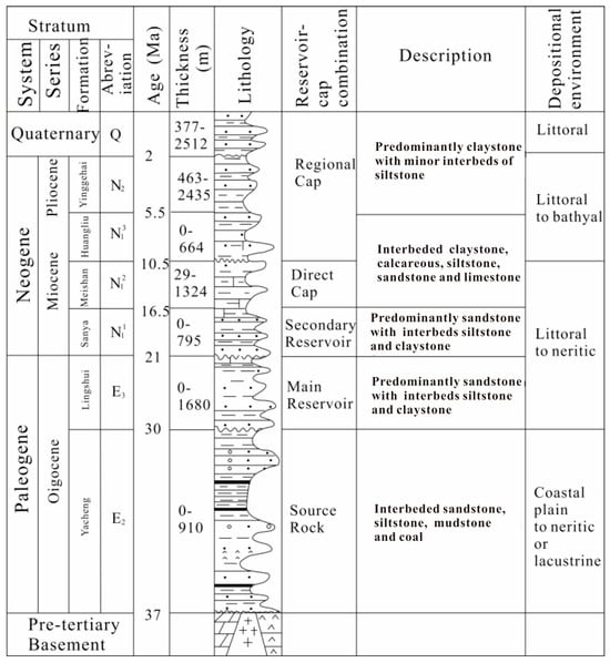 Stratigraphic column of the Qiongdongnan Basin (Reproduced with permission from [Xiao et al.], [Organic Geochemistry]; published by [Elsevier], (2006) []).