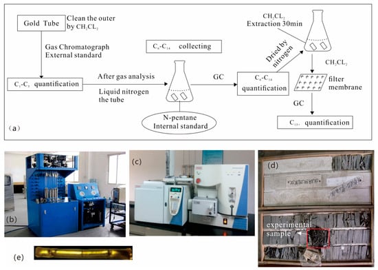 Flow chart of the closed-system analysis experiment. (a) The testing process; (b) fully automatic high-temperature and high-pressure enclosed hydrocarbon generation simulation device; (c) GC-MS; (d) experimental sample; and (e) gold tube 5.5 mm × 60 mm).