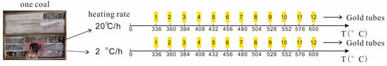 A closed pyrolysis system experiment was completed at Guangzhou Institute of Geochemistry, Chinese Academy Sciences. The testing process and equipment are shown in Figure 4 and Figure 5. The sample (Figure 4d), after being ground to 200 mesh, was divided into 24 parallel aliquots and placed into separate gold tubes (Figure 4e), which were then sealed on one end under argon protection. Thereafter, the sealed gold tubes were placed in autoclaves (Figure 4b). The samples in the autoclaves were heated in a single oven to the target temperature. The experimental pressure was 50 MPa, with an error of <1 MPa observed during the entire pyrolysis procedure []. The temperature was programmed to increase at 2 °C/h and 20 °C/h, with the final target temperatures ranging from 300 to 600 °C. Finally, the tubes were taken out of the autoclave every 24 °C and brought down in temperature, and the hydrocarbon products tested using an Agilent 6890 GC (Agilent, Santa Clara, USA) (Figure 4c). The test data of 24 tubes are listed in Table 1.