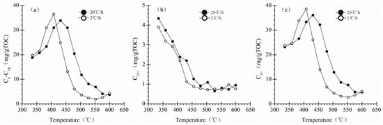 The total oil fraction in our experiment was divided into C6–14 and C15+ compounds. The concentration profiles of the pyrolysis temperatures of C6–14, C15+, and C6+ are shown in Table 1 and Figure 6. The evolution of all the products was similar at both heating rates. As the temperature increased, the concentration of C15+ decreased, and C6–14 reached its peak yield at temperatures of 436 °C and 408 °C at heating rates of 20 °C/h and 2 °C/h, respectively; then the yield began to decrease. C6+ had the same form as C6–14, including the peak temperature. When the concentration declines in a closed pyrolysis system, it is generally recognized that the cracking rate of the product is significantly higher than its generation rate [,].