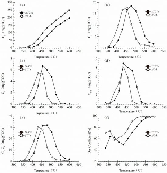 The yield of methane increased slowly at the beginning of the temperature increase, below 400 °C for 20 °C/h or 375 °C for 2 °C/h. The methane then increased rapidly during pyrolysis (Figure 7a). The heavy hydrocarbon gases (C2–5) increased continuously with an increase in the temperature, until 475 °C for 20 °C/h or 425 °C for 2 °C/h, reaching the maximum yield (Figure 7e). After reaching the peak values, the heavy hydrocarbon gases began to crack. The dry coefficient (C1/∑C1–5%) decreased at the beginning and then began to increase to a limit value (Figure 7f). This pattern shows that the content of heavy gas in the low-temperature stage was significantly higher than that of methane []. Studies have shown that as pressure increases, at the same temperature, the degradation rates of kerogen and coal accelerate, leading to an increase in the yield of liquid hydrocarbons and a decrease in the yield of gaseous hydrocarbons in the thermal evolution products []. The main focus of this study is on the impact of temperature on hydrocarbon generation. The pressure condition is constant pressure.