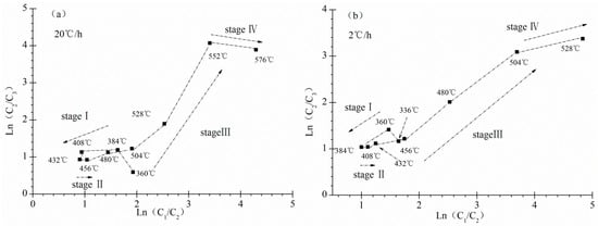 Plots of ln (C1/C2) and ln (C1/C2). (a) The heating rate of 20 °C/h. (b) The heating rate of 2 °C/h.