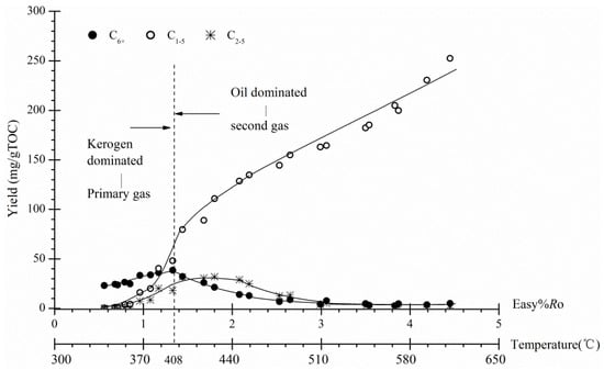 From the Easy%Ro and evolution stages discussed above, the characteristics of hydrocarbon generation during increases in the vitrinite reflectance are shown in Figure 9. Hydrocarbon gases were generated in small amounts at low maturity (<0.8%), and the total yield was lower than the oil yield. The process of cracking C6+ gases could be neglected [,,]. When C2 cracking occurred at a high maturity level, the total gases continuously increased rapidly, so C2 cracking was not the only way that methane was generated in this stage. Overall, we inferred the C1–C5 hydrocarbon gas yield for coal to be approximately 1.33% as the maximum yield of the coal’s primary gas and >1.33% as the secondary gas dominated by oil cracking. In other words, the %Ro of the maximum oil (C6–14) yield was the same as the threshold %Ro of primary and secondary gas. This pattern is similar to the gas generation process of oil-bearing mudstone [].