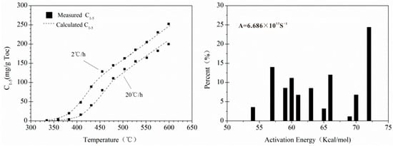 The kinetic parameters showed no significant differences from those of the source rock and its kerogen []. Thus, isolating kerogen from the source rock to calculate the kinetic parameters was unnecessary []. With the aim of calculating the gas potential of the source rock, the kinetic parameters of the total hydrocarbon gas were calibrated in the test rather than those of the compound-specific gas. The kinetic parameters of the reaction, including the activation energy and frequency factor, were calculated using KINETICS (2015) software. As shown in Figure 10, the curve fit of the parameters calculated using the software was similar to that of the experimental data, which were feasibly extrapolated to geological conditions. The activation energy (Ea) distribution of generating C1–5 ranged from 54 to 72 kcal/mol, with a frequency factor of 6.686 × 1014 s−1 for the coal sample from the Yacheng Formation.