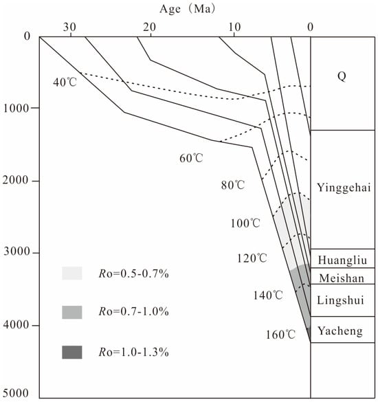 Kinetic parameters are helpful for overcoming the uncertainty in evaluating kinetics and can be reasonably extrapolated to calculate the history of hydrocarbon generation []. Hydrocarbon generation is generally affected by burial history and geotemperature. The YC13-1-A2-well’s burial history and Ro were determined from the Yacheng Formation’s source rocks, whereas the well’s data were provided by the Institute, Zhanjiang Branch of CNOOC Ltd (CNOOC Ltd, Hong Kong, China), and the paleogeothermal gradients used (4.0 °C/100 m) were from Xiao []. The simulation results showed that the burial depths of the Yacheng Formation ranged from 4010 m to 4130 m, and the maximum burial temperature within this well at present can reach 160 °C (Figure 11). The calculated vitrinite reflectance value was 0.7–1.3% Ro, indicating that the source rocks reached the oil and gas generation stage between approximately 5 Ma and now (Figure 11). The temperature and Ro simulations were verified using measured vitrinite reflectance data and other geochemical parameters (Figure 12), indicating that the parameters of this model were credible.
