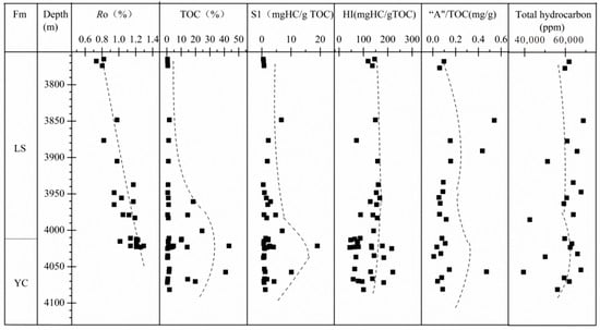 Diagram of various geochemical parameters of the source rocks and depth intervals in the YC13-1-A2 well.