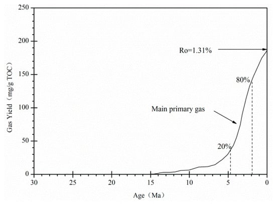 According to the modeling results, the gas generation history and potential were determined, as shown in Figure 13. As discussed above, the hydrocarbon gas generated from the coal’s source rock below 1.33% Ro can be considered the main primary gas. In geological time, the coal from the Yacheng Formation experienced the primary gas generation stage from 5 Ma to now, reaching a maximum generation yield of 178.5 mg/gTOC. Although the vertical and lateral stabilities of the coal seam in the Yanan Depression are not good, the total thickness and gas yield are significant in the Yacheng Formation coal’s source rocks. This structure can provide favorable conditions as a gas source for the formation of large- and medium-sized gas fields.