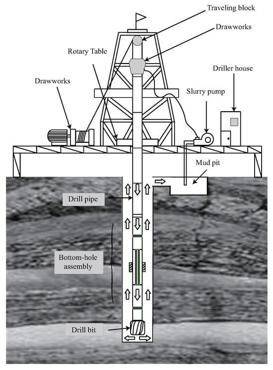 Geological drilling involves a highly complex process, requiring the coordination of multiple components and technologies to drill into the Earth’s crust. As shown in Figure 1, the system consists of a traveling block, draw works, a rotary table, and other components essential for controlling the drill pipe’s movement. The drill bit, positioned at the bottom of the drill string, penetrates underground formations. The bottom-hole assembly includes various tools for guiding and monitoring the drilling process. Mud is pumped down the drill pipe via the slurry pump and returns through the mud pit, carrying debris back to the surface [12]. This process involves managing various parameters such as drilling speed, weight on the bit, and torque to ensure efficiency and safety. Intelligent monitoring plays a critical role in tracking these factors and optimizing drilling operations in real time.