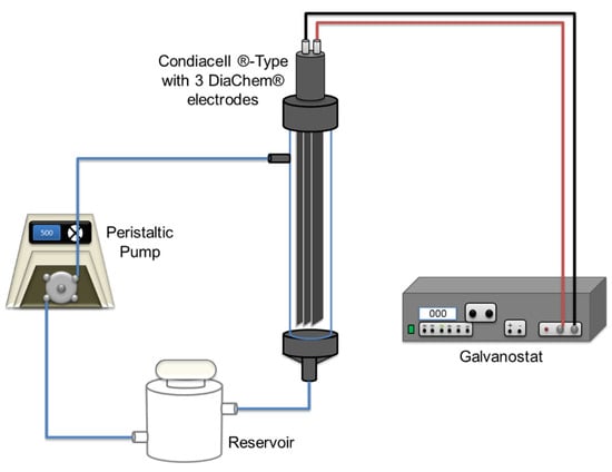 The experiments were conducted at room temperature in a Condiacell® type cell with a 3-BDDE array (Figure 1), where one electrode was the anode (100 cm2) and the other two served as cathodes (200 cm2). The separation between electrodes was 5 mm. The current was controlled with an AMEL Potentiostat–Galvanostat model 2051 (AMEL, Italy). DiaChem® BDDEs (with 1–10 μm conductive diamond layer, 500–8000 ppm boron concentration, and 0.1 Ω cm resistivity) were purchased from Condias GmbH (Itzehoe, Germany). Samples were taken for analysis every 30 min during the degradation time (300 min) and diluted as necessary with electrolyte solution to achieve adequate optical densities.