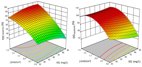 Surface response of DQ concentration and current density on the herbicide removal efficiency.