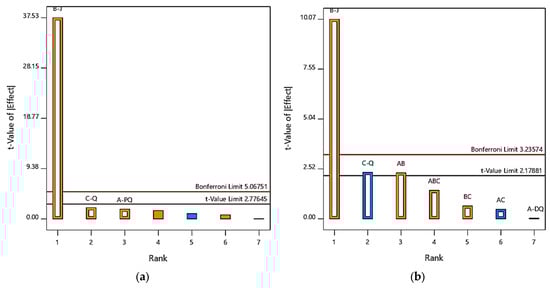 A Pareto chart plot was built to discern the most significant method variables, which were modeled doing the analysis of variance (ANOVA). The Pareto chart depicts the t-values of the effects for each of the model terms [40]. Model terms exceeding the Bonferroni limits were treated as the most significant terms contributing to the response. The model was selected based on the p values with non-significant lack of fit. The response surfaces were generated by the MINITAB 20 and DESIGN EXPERT 11 software to determine the best conditions for PQ and DQ degradation. The polynomial models were statistically confirmed using ANOVA based on the F test, and their quality of fit deduced from the corresponding determination coefficients, R2.